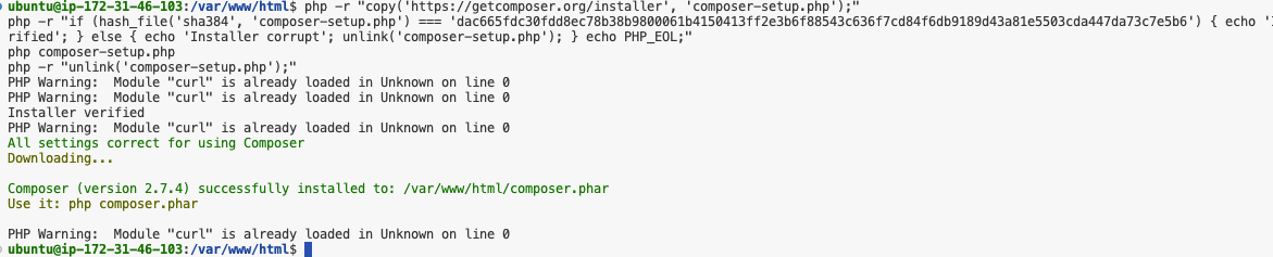 ubuntu@ip-172-31-46-103:/var/www/html$ php -r "copy('https://getcomposer.org/installer', 'composer-setup.php');" php -r "if (hash_file('sha384', 'composer-setup.php') === 'dac665fdc30fdd8ec78b38b9800061b4150413ff2e3b6f88543c636f7cd84f6db9189d43a81e5503cda447da73c7e5b6') { echo 'Installer verified'; } else { echo 'Installer corrupt'; unlink('composer-setup.php'); } echo PHP_EOL;" php composer-setup.php php -r "unlink('composer-setup.php');" PHP Warning: Failed loading Zend extension 'opcache.so' (tried: ./opcache.so (./opcache.so: cannot open shared object file: No such file or directory), ./opcache.so.so (./opcache.so.so: cannot open shared object file: No such file or directory)) in Unknown on line 0 PHP Warning: PHP Startup: Unable to load dynamic library 'curl' (tried: ./curl (./curl: cannot open shared object file: No such file or directory), ./curl.so (./curl.so: cannot open shared object file: No such file or directory)) in Unknown on line 0 PHP Warning: PHP Startup: Unable to load dynamic library 'mysqlnd.so' (tried: ./mysqlnd.so (./mysqlnd.so: cannot open shared object file: No such file or directory), ./mysqlnd.so.so (./mysqlnd.so.so: cannot open shared object file: No such file or directory)) in Unknown on line 0 PHP Warning: PHP Startup: Unable to load dynamic library 'pdo.so' (tried: ./pdo.so (./pdo.so: cannot open shared object file: No such file or directory), ./pdo.so.so (./pdo.so.so: cannot open shared object file: No such file or directory)) in Unknown on line 0 PHP Warning: PHP Startup: Unable to load dynamic library 'xml.so' (tried: ./xml.so (./xml.so: cannot open shared object file: No such file or directory), ./xml.so.so (./xml.so.so: cannot open shared object file: No such file or directory)) in Unknown on line 0 PHP Warning: PHP Startup: Unable to load dynamic library 'calendar.so' (tried: ./calendar.so (./calendar.so: cannot open shared object file: No such file or directory), ./calendar.so.so (./calendar.so.so: cannot open shared object file: No such file or directory)) in Unknown on line 0 PHP Warning: PHP Startup: Unable to load dynamic library 'ctype.so' (tried: ./ctype.so (./ctype.so: cannot open shared object file: No such file or directory), ./ctype.so.so (./ctype.so.so: cannot open shared object file: No such file or directory)) in Unknown on line 0 PHP Warning: PHP Startup: Unable to load dynamic library 'curl.so' (tried: ./curl.so (./curl.so: cannot open shared object file: No such file or directory), ./curl.so.so (./curl.so.so: cannot open shared object file: No such file or directory)) in Unknown on line 0 PHP Warning: PHP Startup: Unable to load dynamic library 'dom.so' (tried: ./dom.so (./dom.so: cannot open shared object file: No such file or directory), ./dom.so.so (./dom.so.so: cannot open shared object file: No such file or directory)) in Unknown on line 0 PHP Warning: PHP Startup: Unable to load dynamic library 'exif.so' (tried: ./exif.so (./exif.so: cannot open shared object file: No such file or directory), ./exif.so.so (./exif.so.so: cannot open shared object file: No such file or directory)) in Unknown on line 0 PHP Warning: PHP Startup: Unable to load dynamic library 'ffi.so' (tried: ./ffi.so (./ffi.so: cannot open shared object file: No such file or directory), ./ffi.so.so (./ffi.so.so: cannot open shared object file: No such file or directory)) in Unknown on line 0 PHP Warning: PHP Startup: Unable to load dynamic library 'fileinfo.so' (tried: ./fileinfo.so (./fileinfo.so: cannot open shared object file: No such file or directory), ./fileinfo.so.so (./fileinfo.so.so: cannot open shared object file: No such file or directory)) in Unknown on line 0 PHP Warning: PHP Startup: Unable to load dynamic library 'ftp.so' (tried: ./ftp.so (./ftp.so: cannot open shared object file: No such file or directory), ./ftp.so.so (./ftp.so.so: cannot open shared object file: No such file or directory)) in Unknown on line 0 PHP Warning: PHP Startup: Unable to load dynamic library 'gd.so' (tried: ./gd.so (./gd.so: cannot open shared object file: No such file or directory), ./gd.so.so (./gd.so.so: cannot open shared object file: No such file or directory)) in Unknown on line 0 PHP Warning: PHP Startup: Unable to load dynamic library 'gettext.so' (tried: ./gettext.so (./gettext.so: cannot open shared object file: No such file or directory), ./gettext.so.so (./gettext.so.so: cannot open shared object file: No such file or directory)) in Unknown on line 0 PHP Warning: PHP Startup: Unable to load dynamic library 'iconv.so' (tried: ./iconv.so (./iconv.so: cannot open shared object file: No such file or directory), ./iconv.so.so (./iconv.so.so: cannot open shared object file: No such file or directory)) in Unknown on line 0 PHP Warning: PHP Startup: Unable to load dynamic library 'mbstring.so' (tried: ./mbstring.so (./mbstring.so: cannot open shared object file: No such file or directory), ./mbstring.so.so (./mbstring.so.so: cannot open shared object file: No such file or directory)) in Unknown on line 0 PHP Warning: PHP Startup: Unable to load dynamic library 'mysqli.so' (tried: ./mysqli.so (./mysqli.so: cannot open shared object file: No such file or directory), ./mysqli.so.so (./mysqli.so.so: cannot open shared object file: No such file or directory)) in Unknown on line 0 PHP Warning: PHP Startup: Unable to load dynamic library 'pdo_mysql.so' (tried: ./pdo_mysql.so (./pdo_mysql.so: cannot open shared object file: No such file or directory), ./pdo_mysql.so.so (./pdo_mysql.so.so: cannot open shared object file: No such file or directory)) in Unknown on line 0 PHP Warning: PHP Startup: Unable to load dynamic library 'phar.so' (tried: ./phar.so (./phar.so: cannot open shared object file: No such file or directory), ./phar.so.so (./phar.so.so: cannot open shared object file: No such file or directory)) in Unknown on line 0 PHP Warning: PHP Startup: Unable to load dynamic library 'posix.so' (tried: ./posix.so (./posix.so: cannot open shared object file: No such file or di